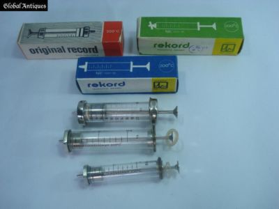 THREE VINTAGE MEDICAL GLASS & BRASS SYRINGES