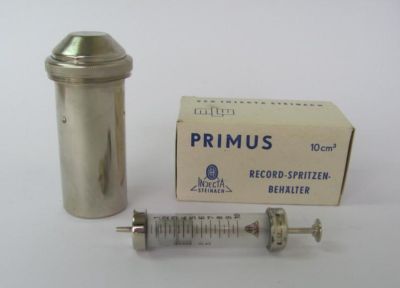 Title (ebay affiliate link): VINTAGE BRASS & GLASS SYRINGE w/STERILIZER PRIMUS MINT