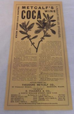 Title (ebay affiliate link): Coca Wine Cure for Opium Habit Safe for Kids Base Ball Players Metcalf's 1880s