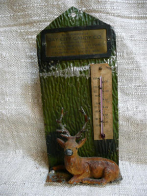 antique 3 dimensional tin advertising thermometer buck deer Bay City Candy Co MI