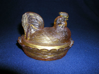 Title (ebay affiliate link): Amber Glass Chicken Rooster on Nest Basket Covered Dish Depression Era