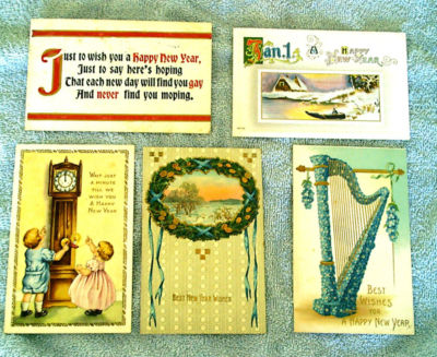Title (ebay affiliate link): Estate Antique New Years postcard lot Kids Grandfather clock Harp