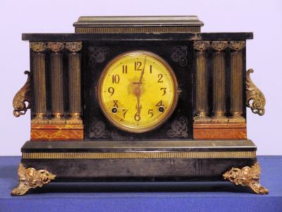 Title (ebay affiliate link): 100 YEAR ANTIQUE INGRAHAM ORNATE MANTEL CLOCK W/KEY & PENDULUM - NEEDS WORK