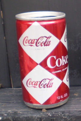 COCA COLA coke 12oz FIRST ALUMINUM ? SODA can HARLEQUIN like bottle sign cap W