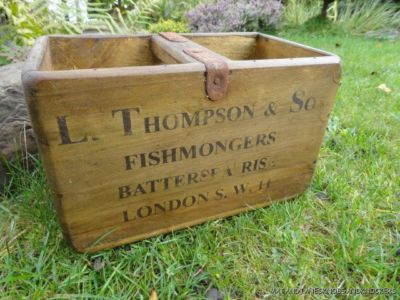 Title (ebay affiliate link): WOODEN BATTERSEA RISE LONDON FISHMONGERS SHELLFISH BLOATERS TRUG FISH CRATE BOX