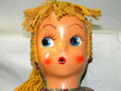 Title (ebay affiliate link): Antique COMPOSITION 21" Doll Straw filled Rag Doll Painted Hard Face Yarn Hair