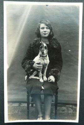 POSTCARD PHOTO YOUNG WOMAN WITH HER TERRIER DOG SITTING ON HER LAP early 20thC