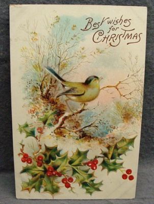 Title (ebay affiliate link): 1909 Postcard Christmas Wishes Embossed Bird Holly & Berries