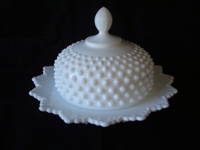 Vintage Milk Glass Covered Round Butter Dish Hobnail