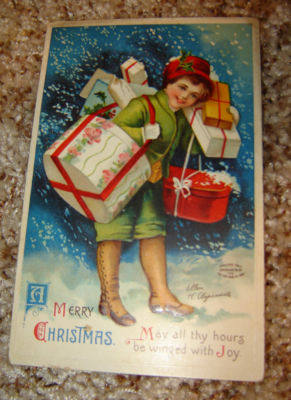 POSTCARD VINTAGE CHRISTMAS ELLEN CLAPSADDLE BOY WITH PACKAGES ARTIST SIGNED