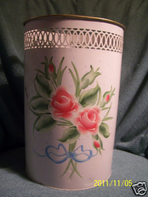Title (ebay affiliate link): VINTAGE TOLEWARE WASTEBASKET HAND PAINTED PINK ROSES SUPER COTTAGE SHABBY