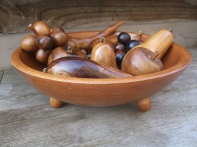 VTG Primitive Footed Wooden Bowl w/Wood & Leather Fruit