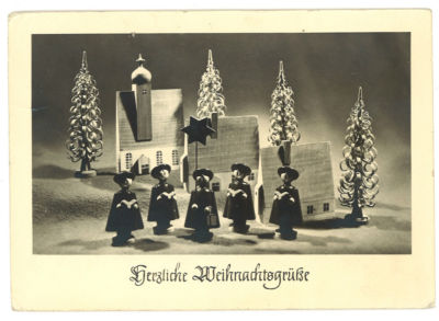 Vintage German Christmas Post Card Winter scene display with blue stamp