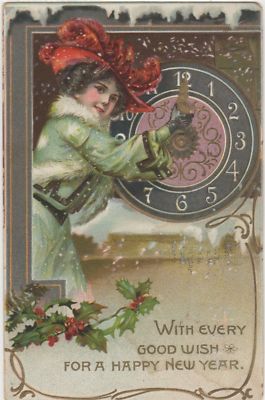 Title (ebay affiliate link): TUCK'S POST CARD OF NEW YEAR'S WITH LADY PUTTING CLOCK AT 12:00