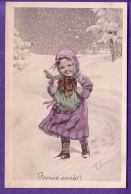 Title (ebay affiliate link): ILLUSTRATED POSTCARD FEIERTAG GIRL WITH DACHSHUND DOG