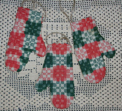 Title (ebay affiliate link): Primitive CHRISTMAS Mitten Ornies Red Green Woven Vintage Coverlet Mitten Tucks