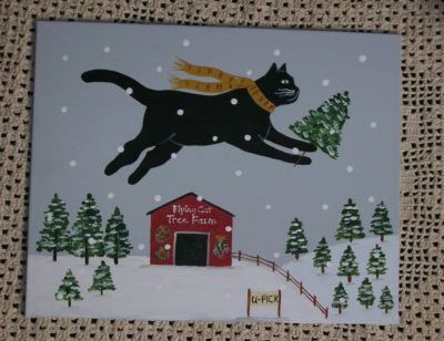 Title (ebay affiliate link): PRIMITIVE Folk Art FLYIN CAT Painting Black Cat Tree Farm Handpainted Folk Art