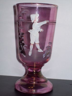 Title (ebay affiliate link): One Iridescent/Frosted Cranberry Pink Mary Gregory Footed Goblet/Glasse