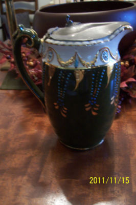 19th Century Hand Painted Syrup Pitcher With Pewter Lid