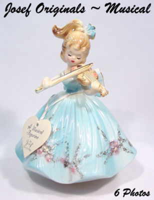 Title (ebay affiliate link): Vintage JOSEF ORIGINALS Musical Pony Tailed Girl Playing Violin in Blue & Pink