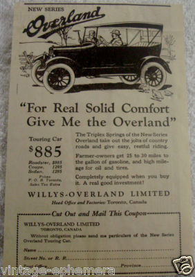 Title (ebay affiliate link): 1922 WILLYS KNIGHT CAR AD CANADA OVERLAND TOURING CAR $885 TORONTO ONT