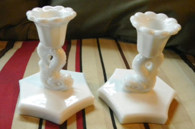 Title (ebay affiliate link): Pair Westmoreland Dolphin Fish Candle Holders Stick White Milk Glass Short