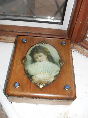 Title (ebay affiliate link): EDWARDIAN ENAMEL CABOCHON & BRASS WOODEN JEWELLERY BOX