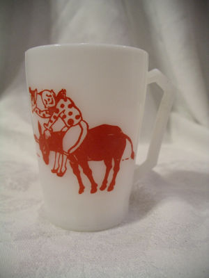 Title (ebay affiliate link): VINTAGE MILK GLASS RED & WHITE CIRCUS DESIGN,CLOWNS,DONKEY, CHILD'S CUP,MUG