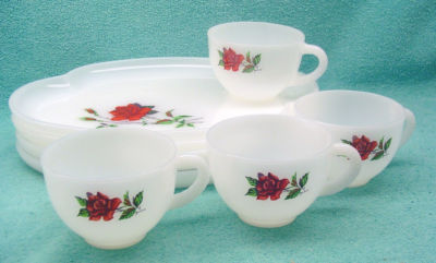 Title (ebay affiliate link): 8 Pc Rose Crest Snack Set White Milk Glass Red Rose Motif -Federal Glass