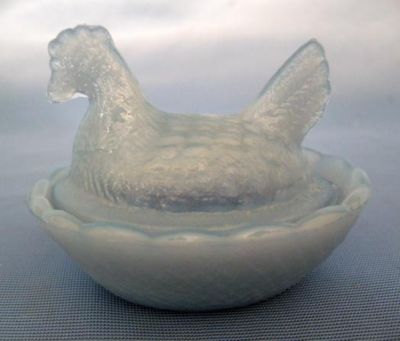 Title (ebay affiliate link): MINI HEN on the NEST OPEN SALT / DIP LIGHT BLUE MILK GLASS CHICKEN