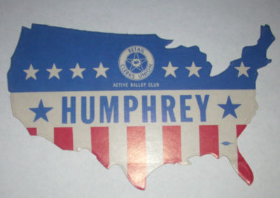 Title (ebay affiliate link): 1960's HUBERT HUMPHREY Campaign Decal United States Shaped Retail Clerks Union