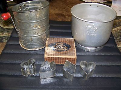 Title (ebay affiliate link): Vintage Primative Flour Sifters and Card Themed cookie cutter lot! Fagley, Foley