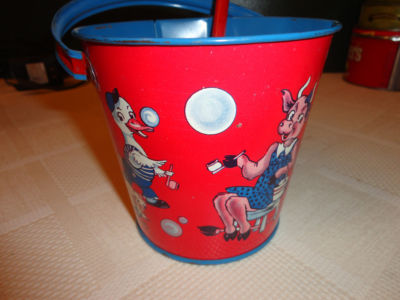 Title (ebay affiliate link): VINTAGE TIN PAIL AND SHOVEL T. CONN FARM ANIMALS BLOWING BUBBLES CHEERY