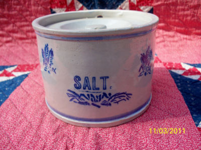 Title (ebay affiliate link): early / old stoneware salt box crock blue bands stencils