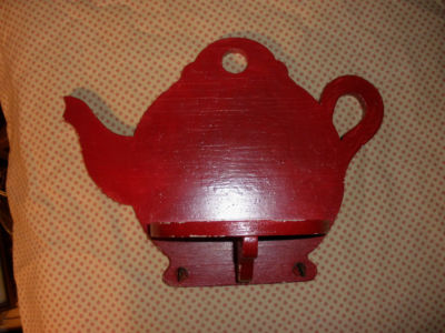 Title (ebay affiliate link): Vintage Primitive Red Wood Teapot Shaped Shelf with Hooks