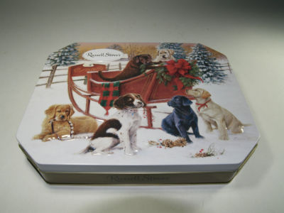 Title (ebay affiliate link): Russell Stover EMBOSSED candy tin "The Christmas Sleigh" James H Killen 2011