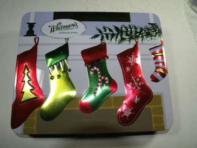 Title (ebay affiliate link): Whitman's Chocolates 2011 tin 5 colorful stockings hung on the fireplace