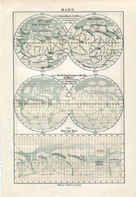 1894 MARS HEMISPHERES ASTRONOMY Antique Map