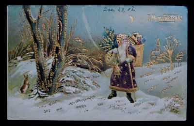 Title (ebay affiliate link): 1908 ANTIQUE CHRISTMAS POSTCARD SANTA LONG PURPLE COAT GOLD LEAF TOY DOLL RABBIT