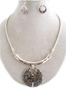 ANTIQUE SILVER METAL LINK ABALONE PENDANT NECKLACE SET