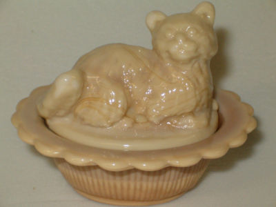 Title (ebay affiliate link): CHOCOLATE MARBLE SLAG GLASS CAT / KITTEN ON NEST BASKET AMBER AND MILK SALT CELT