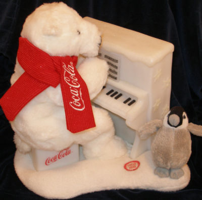 Title (ebay affiliate link): COKE COCA-COLA ANIMATED CHRISTMAS PLUSH POLAR BEAR PLAYING PIANO W/ PENGUIN CHUM