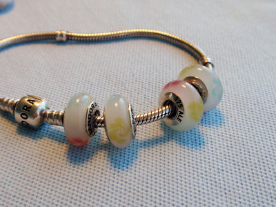 Title (ebay affiliate link): Authentic Pandora Murano Glass bead "Pink blue and Yellow flowers on Milk Glas"