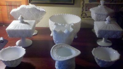 Title (ebay affiliate link): Milk Glass Westmoreland, Imperial Glass, Fenton Daisy and Button hat lot