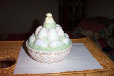 Title (ebay affiliate link): Westmoreland milk glass chick on iridized egg pile-bead eyes-covered animal dish