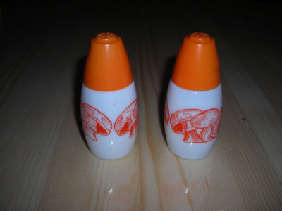 Title (ebay affiliate link): Vintage Milk Glass Salt & Pepper Shakers with Orange Lids & Mushrooms-Marked 'W'