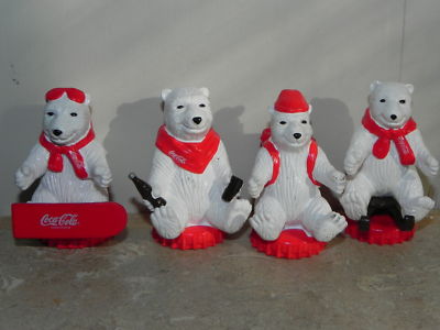 Title (ebay affiliate link): 4 Coca Cola Polar bear figurines riding bottle caps