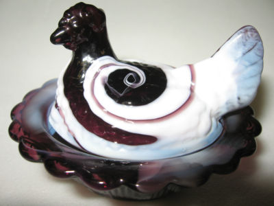 Title (ebay affiliate link): PURPLE AMETHYST AND MILK SLAG GLASS HEN CHICKEN ON NEST BASKET BLACK ROOSTER EGG