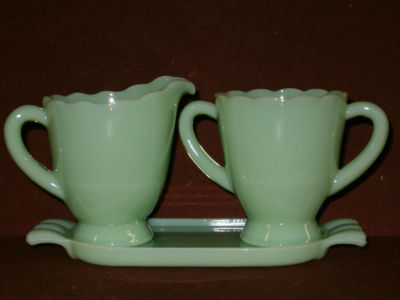 Title (ebay affiliate link): JADEITE JADITE ART GLASS CREAMER AND SUGAR SET WITH TRAY JADE GREEN MILK OPAQUE