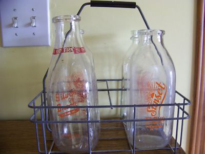 Title (ebay affiliate link): 4 antique glass quart milk bottles in handled wire carrier